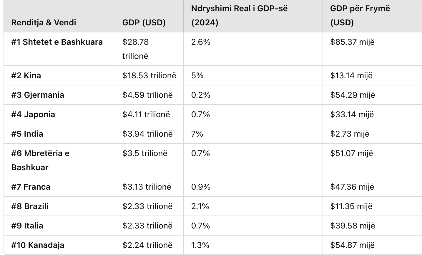 Në vitin 2024, Shtetet e Bashkuara mbeten ekonomia më e madhe në botë me një GDP prej 28.78 trilionë dollarësh, duke vazhduar të udhëheqin në investime dhe konsum. Kina qëndron në vendin e dytë, duke ruajtur një rritje të shëndetshme me 5%. Ndërkohë, Gjermania, Japonia, dhe India përfundojnë pesëshen kryesore, duke reflektuar përparimet e tyre ekonomike përkatëse, me Indinë që ka rritjen më të lartë prej 7%.