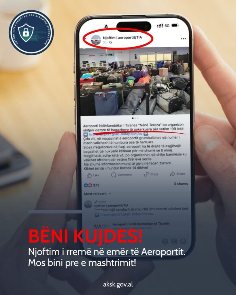 Së fundmi, një postim i rremë në rrjetet sociale ka shpërndarë një njoftim në emër të Aeroportit të Tiranës për “shitje valixhesh të mbetura”, duke përfshirë një link të dyshimtë me qëllim mbledhjen e të dhënave personale dhe bankare.