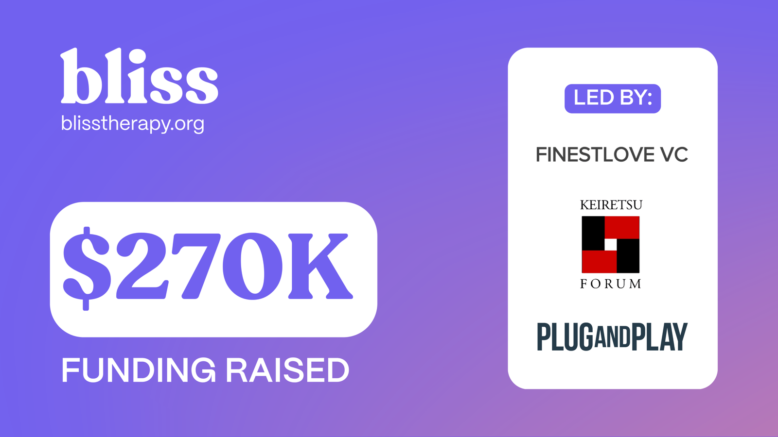 Raundi i investimit udhëhiqet nga Keiretsu Forum Southeast Europe, Finest Love VC dhe Plug and Play, dhe përfshin gjithashtu grante nga programe inovacioni si EU4Innovation & Startup Albania. Ky investim shënon një moment të rëndësishëm për ekosistemin shqiptar të startup-eve: është investimi i parë në një startup shqiptar nga këta investitorë ndërkombëtarë dhe një nga rastet e para kur një kompani e themeluar nga Shqipëria arrin të tërheqë kapital nga rrjete globale të këtij niveli. Bliss është gjithashtu një nga startup-et e rralla në rajon të udhëhequra nga një solo female founder.