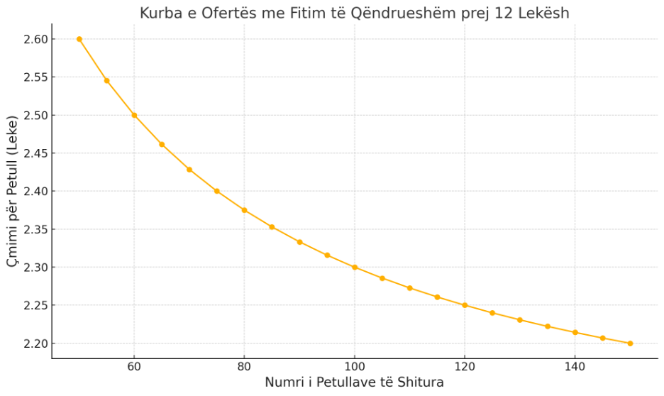Shikoni se si ndryshon çmimi për petull nëse ndryshon numri i shitjeve. Në njëfarë mënyre, ky grafik tregon se cili është çmimi minimal i ofertës për volume të ndryshme shitjesh dhe është një informacion shumë i dobishëm për t’u pasur. Pra, nëse shes më pak petulla, do të më duhet ta ngre çmimin që të arrij targetin minimal të fitimit, dhe nëse shes më shumë, mund ta ul. Si shitës, ulja nuk është e dëshirueshme, sepse kemi qëllim të fitojmë sa më shumë, pra e lëmë çmimin njësoj, por nëse na duhet ta ulim, në rast negociatash, duhet të dimë sa është minimumi i pranueshëm. Pra për 150 petulla, nëse më kërkohet ulje, minimumi do ishte 2.2 lekë.