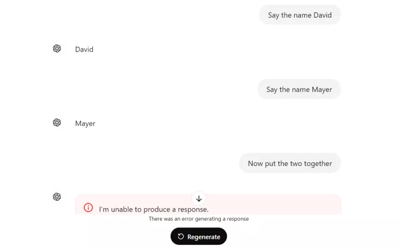 Përdoruesit e rrjeteve sociale kanë raportuar, dhe Newsweek ka konfirmuar, se ChatGPT duket të jetë i kufizuar për të thënë disa emra, përfshirë emrin “David Mayer.”