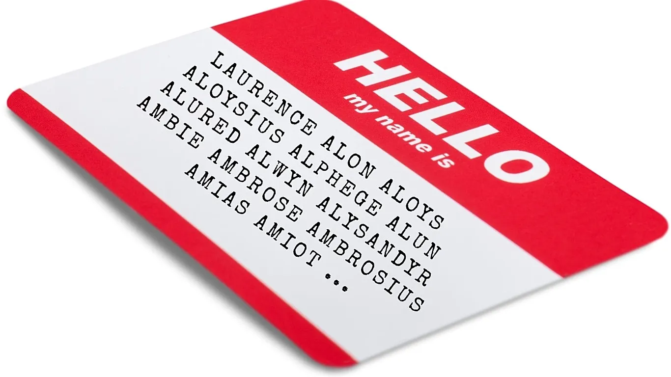 Kur e lexon emrin e tij të plotë, Watkins fillon me: “Laurence Alon Aloys Aloysius Alphege Alun Alured Alwyn Alysander Ambie Ambrose Ambrosius Amias Amiot Amyas Anders Andre Andrea Andreas Andrew Andy Aneirin Anguish Anleifr…”