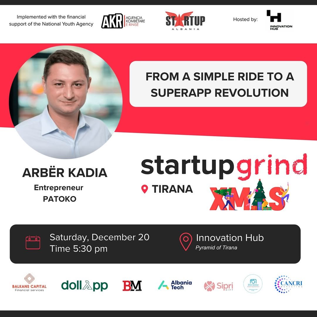 Startup Grind Tirana do të mbledhë sërish komunitetin e sipërmarrjes dhe inovacionit në një aktivitet të veçantë, ku i ftuar do të jetë Arbër Kadia, bashkëthemelues dhe CEO i Patoko, superaplikacioni i parë shqiptar që ka transformuar mënyrën se si qytetarët lëvizin, rezervojnë shërbime dhe menaxhojnë përditshmërinë e tyre.