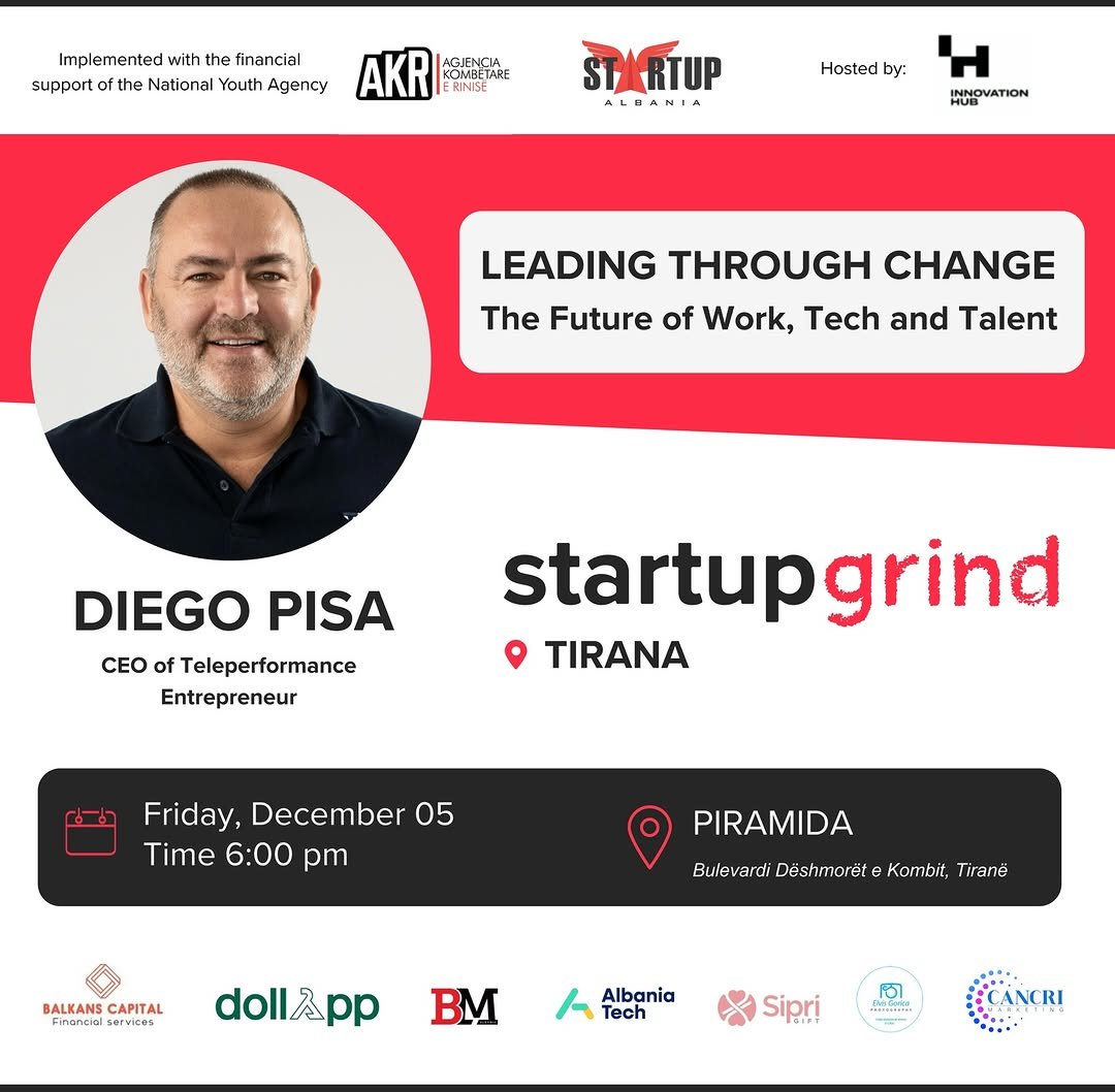 Startup Grind Tirana sjell në skenë Diego Pisa-n, liderin që drejton dy nga tregjet më dinamike të Teleperformance, për të folur hapur mbi çfarë duhet me të vërtetë për të rritur dhe transformuar një biznes në një botë që nuk ngadalëson asnjëherë.