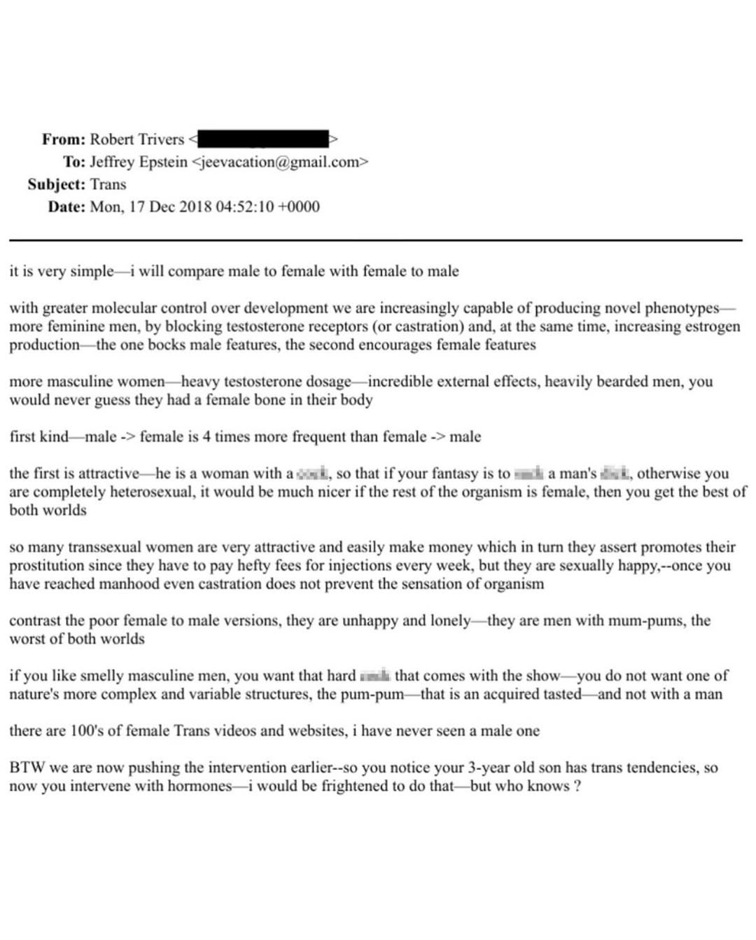 Një zhvillim tjetër që la pa fjalë disa aktivistë LGBT: Jeffrey Epstein diskutoi me biologë amerikanë në vitin 2018 për shtyrjen e ideologjisë transgjinore te të miturit për “kastrimin”, vite përpara se transgjinorizmi të glorifikohej gjerësisht në media.