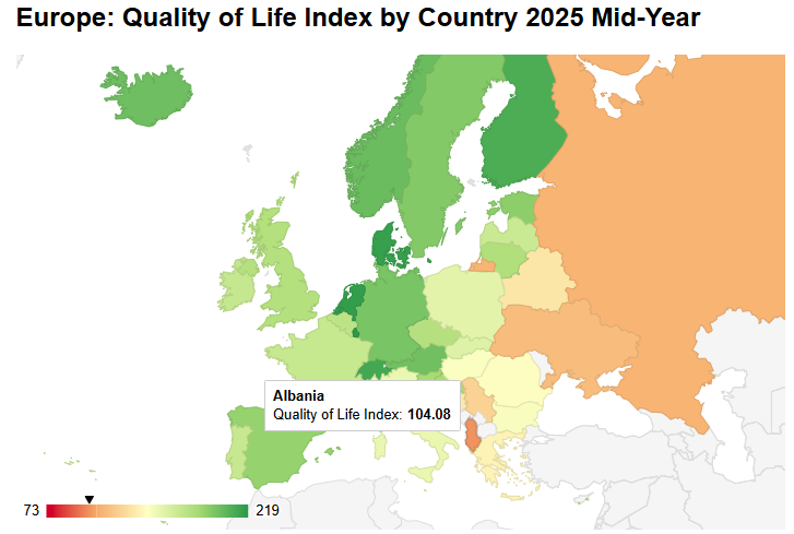 Shqipëria është vendosur në fund të listës për cilësinë e jetesës në Europë, sipas raportit më të fundit të platformës ndërkombëtare Numbeo për gjysmën e parë të vitit 2025. Me një vlerësim total prej 104.1 pikësh në indeksin e cilësisë së jetës, Shqipëria zë vendin e 37-të ndër 37 shtete europiane të analizuara.