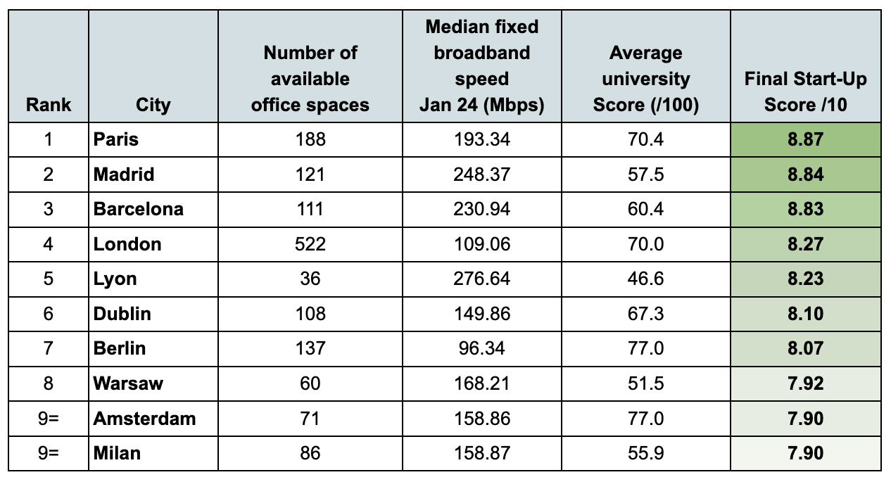 Me këtë në mendje, ekspertët në The Knowledge Academy u përpoqën të zbulonin se cilat qytete në Europë janë më të mirat për startupet, duke analizuar faktorë të tillë si numri i hapësirave të disponueshme për zyra, median fixed broadband speed (Mbps) dhe mesatarja e universitetit.