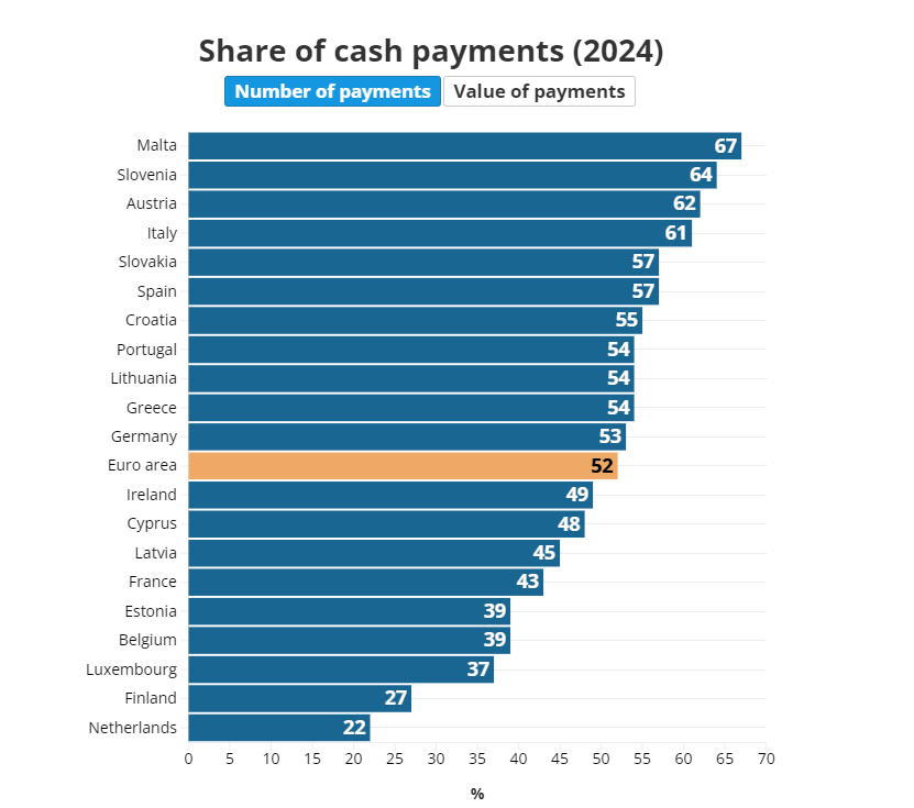 Në 14 nga 20 vendet e eurozonës, paraja fizike është mënyra më e përdorur e pagesës, duke përbërë midis 45% dhe 55% të transaksioneve në gjysmën e tyre.