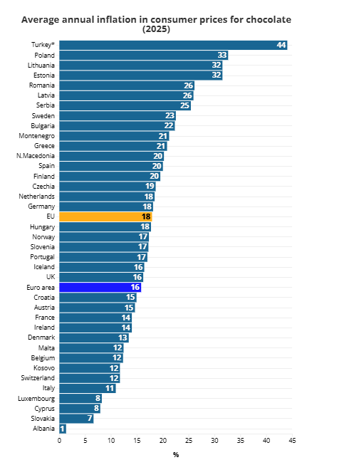 Në vitin 2025, inflacioni mesatar i çmimeve të konsumit në BE ishte 2.5%, ndërsa për kategorinë e ushqimeve dhe pijeve joalkoolike arriti në 3.3%. Megjithatë, çokollata ishte produkti me rritjen më të madhe të çmimeve. Për krahasim, çmimet e mishit të viçit dhe mishit të lopës u rritën rreth 10%, ndërsa vezët dhe gjalpi rreth 8%, shumë më pak se çokollata.