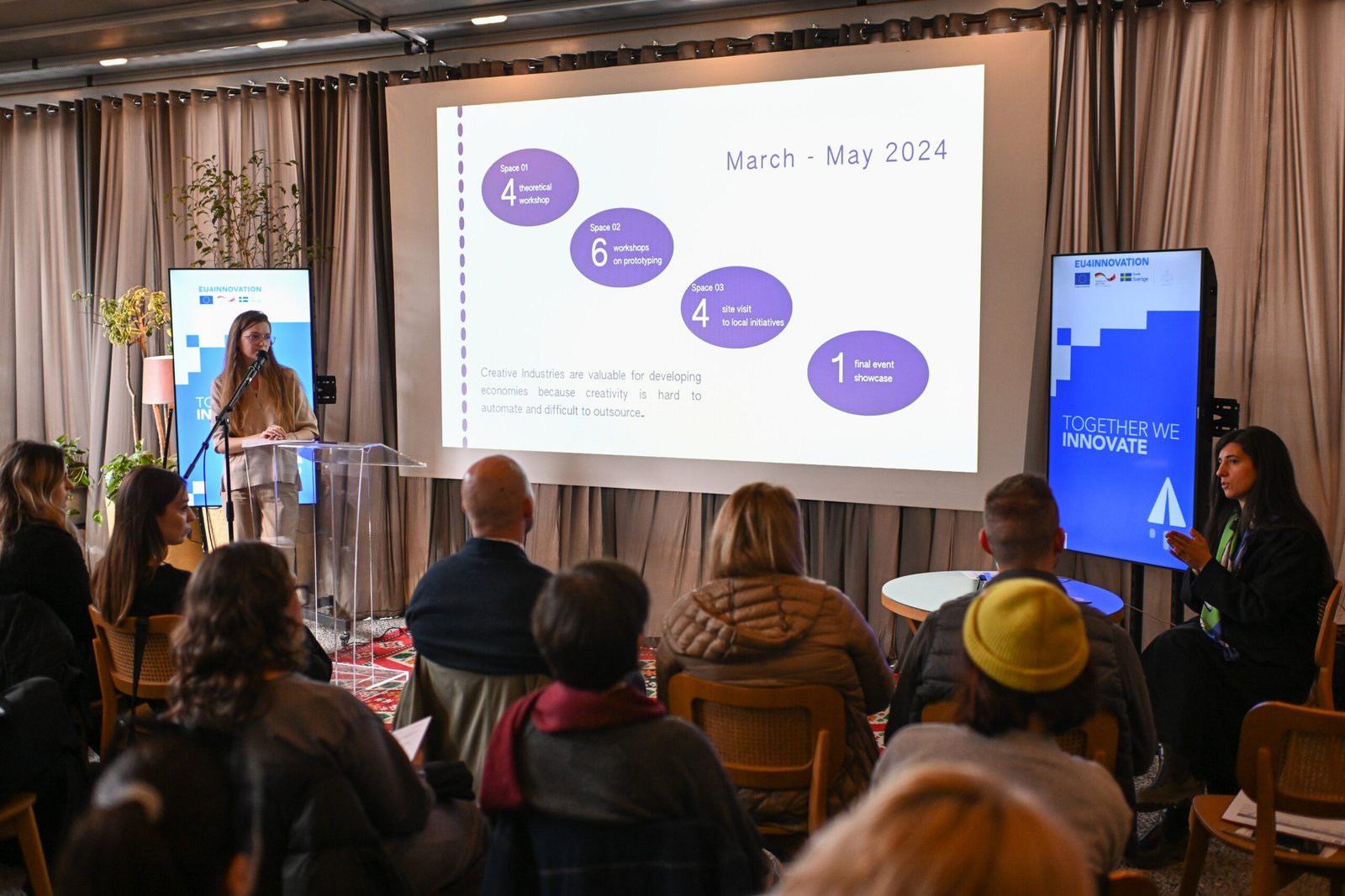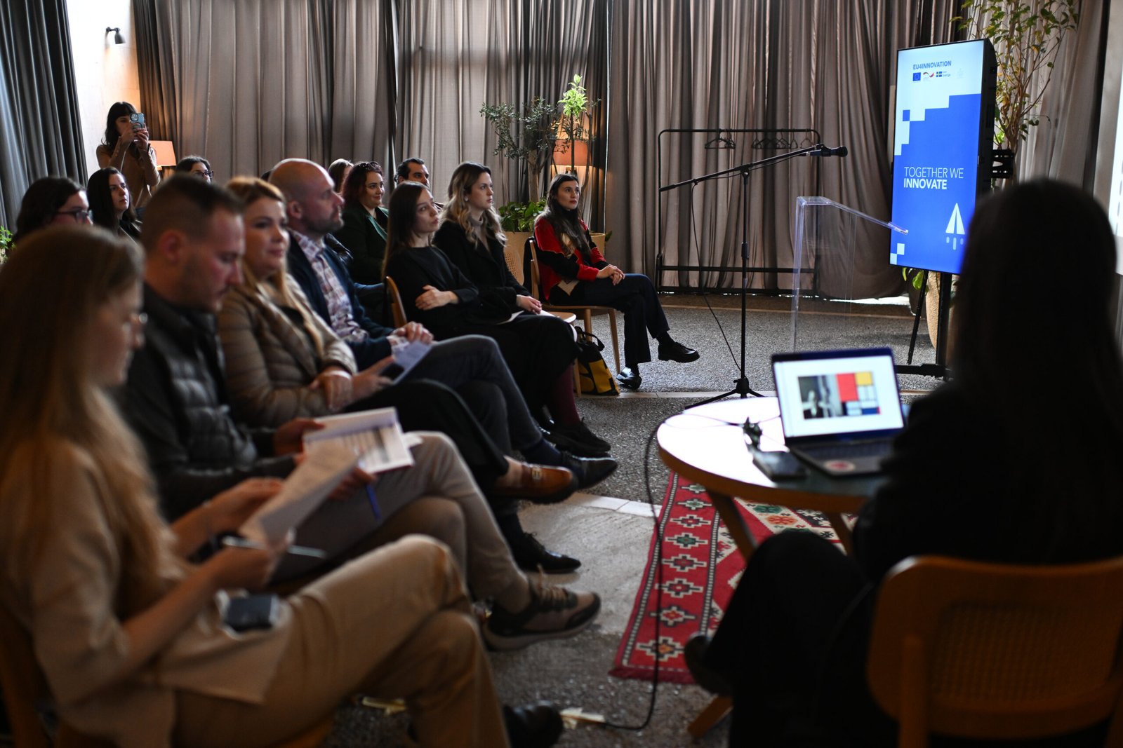 Sebastian Berwanger, Drejtues i projektit EU4Innovation përgëzoi pjesëmarrësit për numrin e lartë të grave që po marrin pjesë në këtë program dhe i uroi sukses në rrugëtimin e sipërmarrës. Së shpejti do të mësojmë më shumë rreth artistëve që po marrin pjesë në .S.E.A.M. si dhe për produktet e tyre.