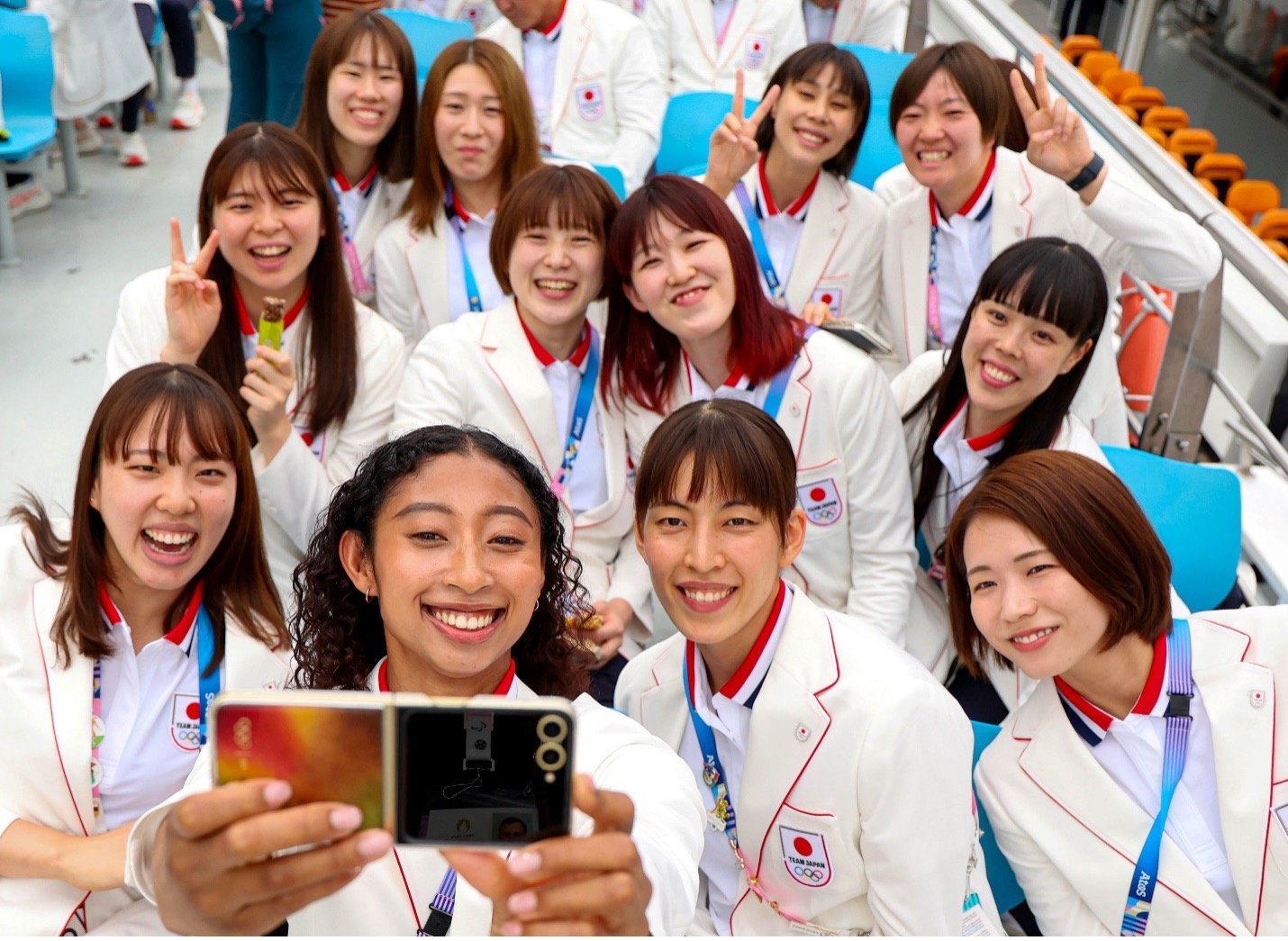 Ekipi i atletëve të Japonisë ndajnë një selfie me fansat me versionin e ri Olimpik Samsung Galaxy Z Flip6. Foto: Getty / Samsung