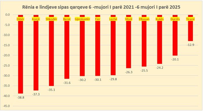 Të dhënat e krahasueshme të INSTAT tregojnë së ndërmjet 6 mujorit të parë 2021 dhe atij 2025 lindjet kanë pësuar rënie drastike sidomos në qarqet e Shkodrës, Dibrës dhe Korçës.