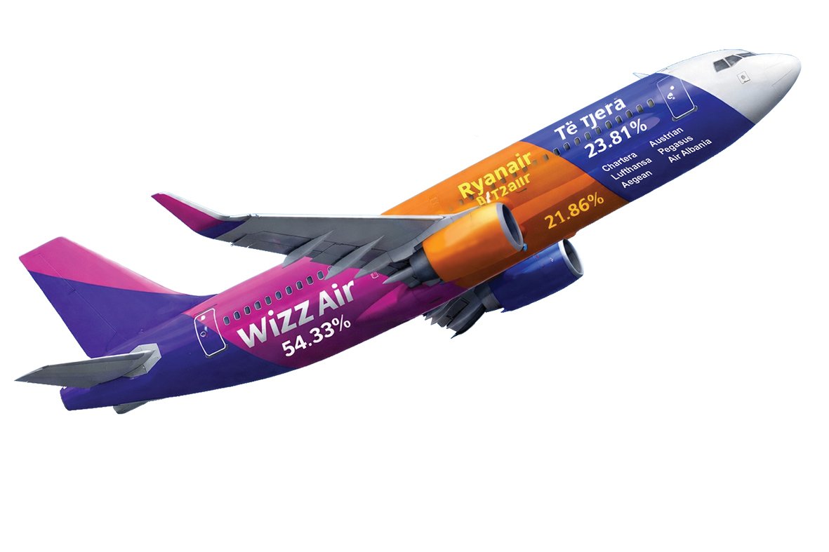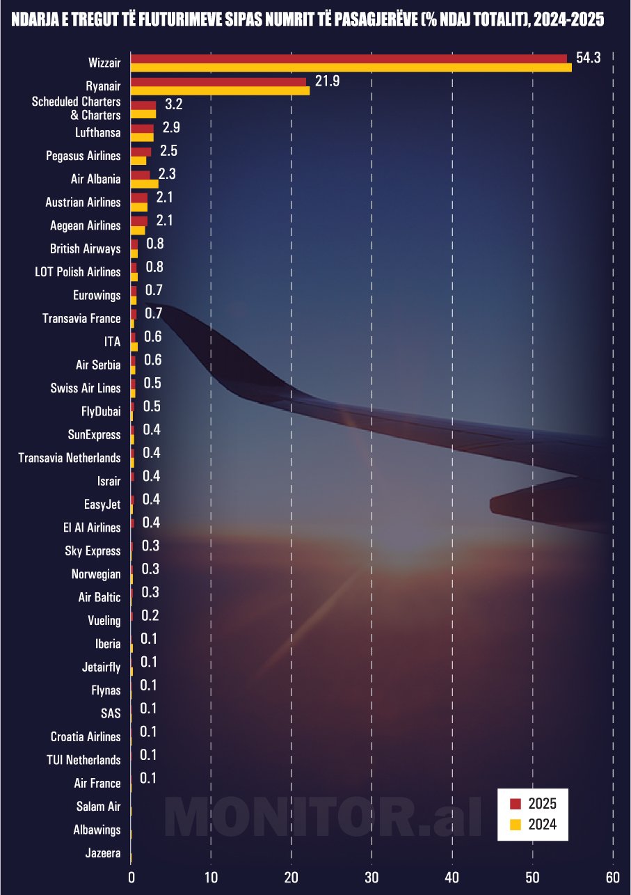 “Wizz Air”, kompania me origjinë hungareze, mbetet operatori më i madh i fluturimeve ajrore në vend, që ka arritur të ruajë pothuajse të njëjtën peshë tregu në 2025-n, pasi humbi lehtë terren në vitin 2024, me hyrjen e konkurrentit tjetër me kosto të ulët “Ryanair”.