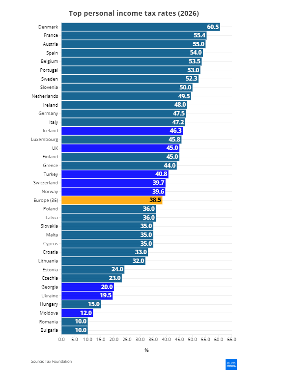 Normat më të larta të tatimit mbi të ardhurat personale variojnë nga 10% në Bullgari dhe Rumani deri në 60.5% në Danimarkë në vitin 2026, sipas Tax Foundation.