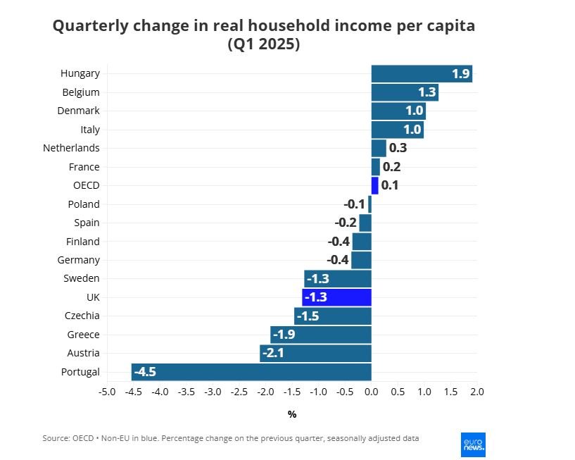 Në shumë vende evropiane, të ardhurat reale të familjeve për frymë shënuan rënie në krahasim me tremujorin e mëparshëm. Ndër ekonomitë më të mëdha të Europës, Mbretëria e Bashkuar regjistroi rënien më të theksuar, me 1,3%. Në kontrast, të ardhurat reale të Produktit të Brendshëm Bruto për frymë u rritën në shumicën e vendeve evropiane.