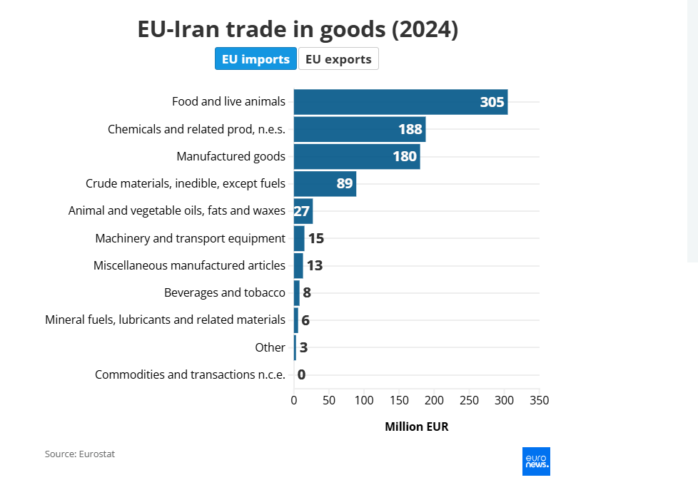Sipas të dhënave nga Eurostat, tregtia totale e mallrave mes BE-së dhe Iranit në vitin 2025 arriti në vetëm 3.72 miliardë euro.