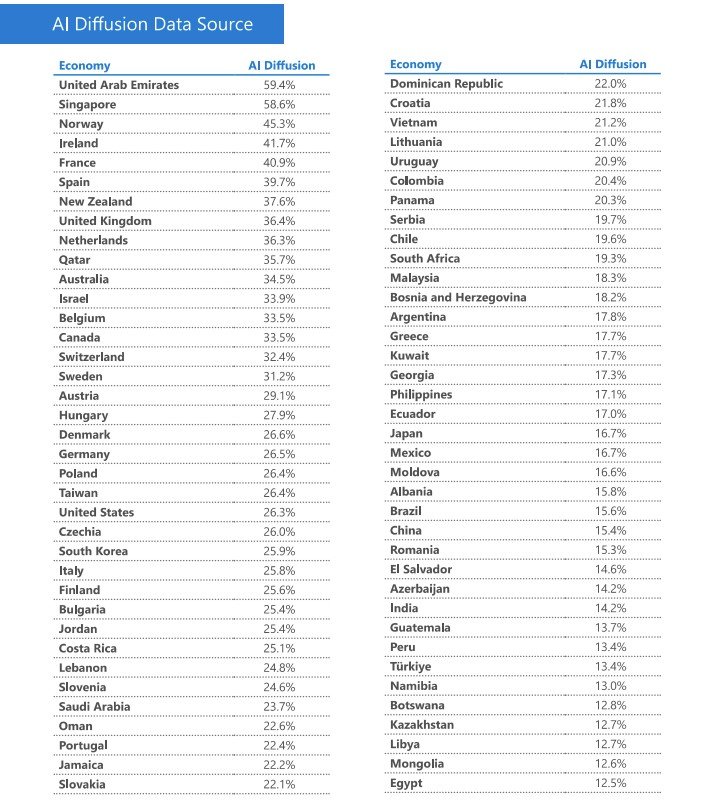 Microsoft thekson se, në shkallë globale, adoptimi i AI lidhet ngushtë me nivelin e zhvillimit ekonomik të një vendi. Në Global North, adoptimi arrin rreth 23%, krahasuar me 13% në Global South.