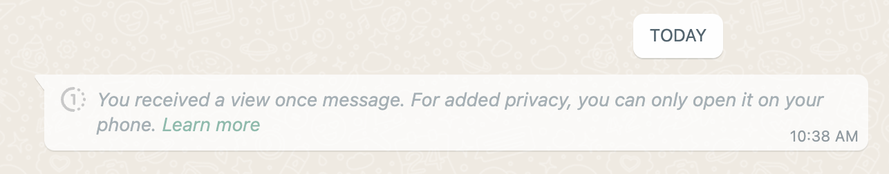 Në testin e TechCrunch, kur morëm një mesazh “View Once” në aplikacionin web të WhatsApp, aplikacioni shfaqi mesazhin e mëposhtëm. Ky mesazh është i njëjtë me atë që zakonisht shfaqet në aplikacionin desktop.